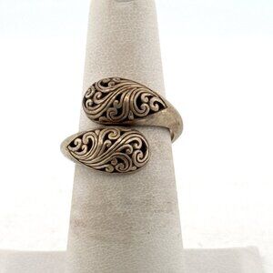 This is a beautiful estate Sterling Silver 925 bypass ring featuring intricate vintage-inspired swirl patterns on both ends of the open band. Crafted with a Balinese or artisan-style design, the ring wraps elegantly around the finger, creating a timeless and detailed aesthetic. The inside is hallmarked "ATI 925", indicating quality craftsmanship and sterling silver composition.