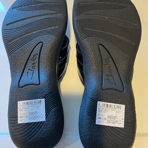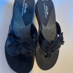Clarks Cloud steppers Black Slide Sandals with Floral Accent.
