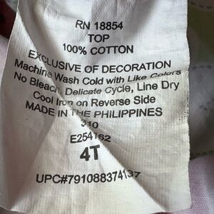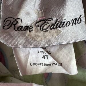 Toddler girl top from Rare Editions. Size 4T. Sleeveless pink polka dot top with green and pink floral print below. Ruffle around the hemline. Blue and white striped fixed straps crisscross in the back. Smocked back. Green grosgrain ribbon bow attached to one strap. Good used condition.