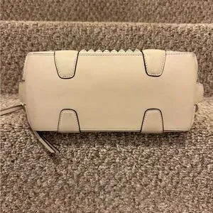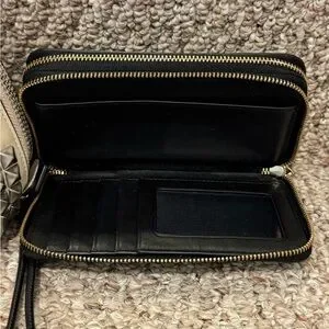 The wallet has wear, but is still in usable condition! Double zip closure! Can be worn alone as a wristlet! 6”x3.5”x1”