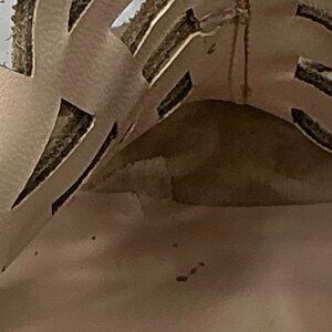 These pre-owned cork wedge sandals are in good condition, although there are some signs of wear on the soles. There is an extra piece of material on the left sole near the toe. There is a written number on the bottom sole. Step into summer with these stylish shoes, featuring a soft suede leather upper, an adjustable ankle strap, and a breathable cutout design that combines style and comfort. The natural cork wedge adds a warm, earthy touch, making them perfect for brunch, vacation, or everyday wear. Please review pictures and ask questions.