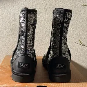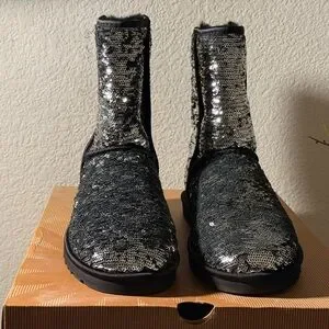 Embrace the winter season with these UGG boots, featuring a stunning black and silver sequin design. The mid-calf height and classic silhouette offer both style and comfort, while the reversible sequins add a touch of glamour and interactivity. Perfect for keeping your feet warm and stylish during cold, rainy days.