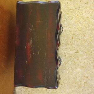This vintage brown miniature wooden cabinet by Norleans could be used for jewelry or collectibles. It features beautiful curved lines and Queen Anne legs. It has six drawers lined in red velvet. If desired, it could also be used as a dresser for a My Twinn or other large doll! 12.5 inches long. 6.5 inches deep. 9 inches tall. Made in Japan. Fair condition. Shows wear and scratches. Does not look new!