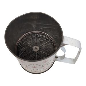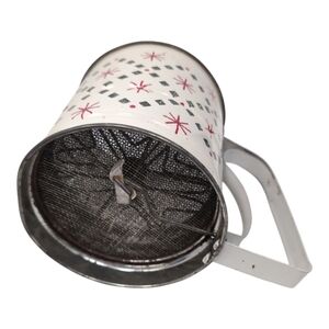 Charming vintage metal flour sifter featuring a red and black geometric pattern on a white background. Perfect for collectors or as a unique kitchen decor.