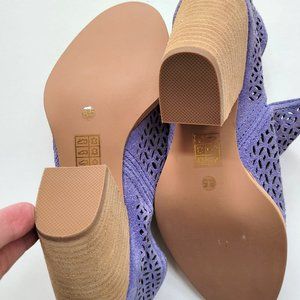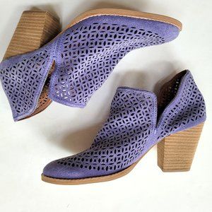 Stylish purple ankle booties. Features intricate cut-out design. Comfortable block heel.