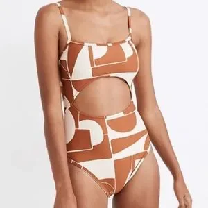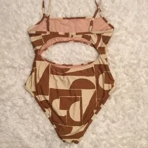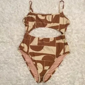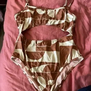 Stylish one-piece swimsuit. Features a unique cut-out design. Comfortable and chic. Still in great shape, last two photos are mine, don’t mind the wrinkles!