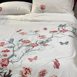 Add a touch of nature to your bedroom with this beautiful set of IKEA JÄTTELILJA duvet covers and pillowcases. The white floral pattern with bird and flower themes is perfect for creating a cozy and comfortable atmosphere. Made with a combination of 100% polyester and 100% lyocell, these materials are soft and durable, ensuring long-lasting use. The set includes a queen-sized duvet cover and two pillowcases, making it a great addition to any bedroom decor. The embroidery details add a unique touch to the overall design, making it stand out. Perfect for any home, this set is sure to bring joy and relaxation to your bedroom.