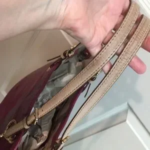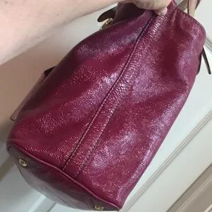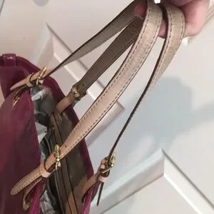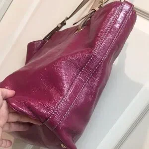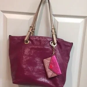 RARE “MK” raspberry patent tote bag is perfect for any occasion. It features a matching glittered keychain with a removable gold tone heart fastener for added flair. Ideal for women who love a pop of color in their accessories!