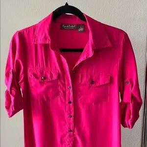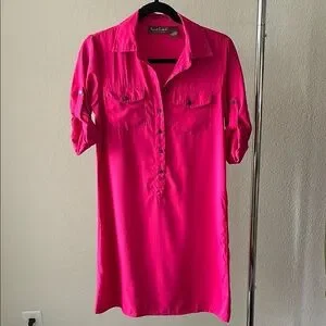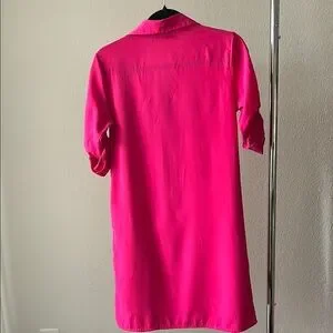Bright pink dress with button-up front. Perfect for casual or formal wear.