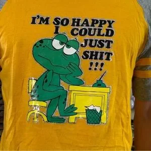 Length 26.5 inches, pit to pit flat across 19.5 inches. Vintage 1980s goldenrod and gray single stitch short sleeve crewneck ringer tee with hilarious frog graphic screen printed at front. Marked a size large but fits closer to a unisex size M.
