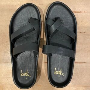 Experience the elegance of Beek's black sandals, crafted with premium leather straps in a chic cross-over design. These minimalist sandals feature a comfortable flat sole and a toe-loop style, perfect for versatile styling. The monochromatic black finish adds a touch of sophistication to any outfit.