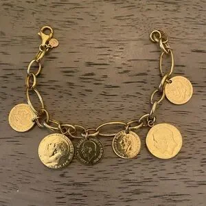 NEW! Never worn, Stunning ITALY 925 stamped Sterling Silver - 24k gold-plated Curb Link Euro Coin Charm Bracelet. MSRP $675