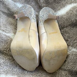 Elegant champagne heels with sparkling embellishments. Perfect for special occasions. I removed Aldo logo from the bottom of the shoe. Great condition, I had these shoes on only several times.