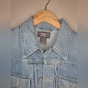 Classic light blue jean jacket by Polo Ralph Lauren. Features button front and chest pockets. Timeless style.