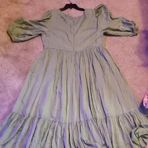 Wore it once. Embrace casual elegance with this JessaKae sundress, featuring a vibrant green hue and a charming ruffled, tiered design. The dress boasts a square neckline and playful puff sleeves, adding a touch of vintage flair. Its comfortable A-line silhouette and peter pan collar make it perfect for relaxed outings.