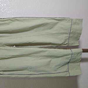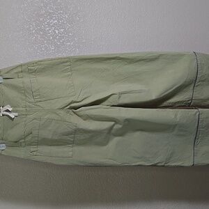 Stylish wide-leg pants with a button-up front. Features a subtle green stripe pattern. Perfect for casual outings.
