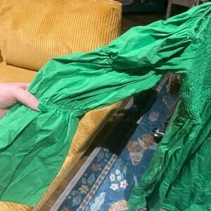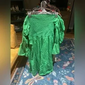 Chic green dress with smocked bodice and flowing sleeves. Perfect for any occasion.