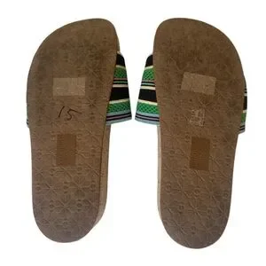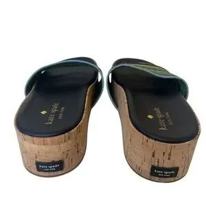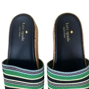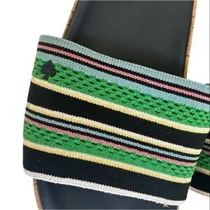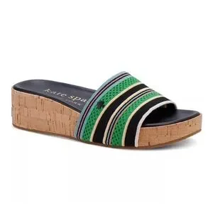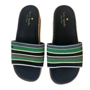 KATE SPADE NEW YORK Stripped Breeze Slide Platform Wedges is gentle worn. Size: 8. Featuring a vibrant green striped design, these sandals offer both comfort and elegance. Perfect for casual outings or a day at the beach.