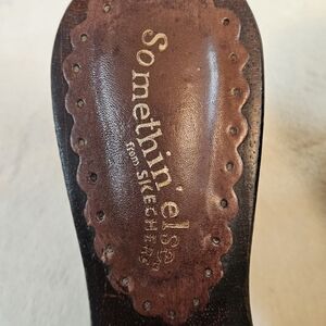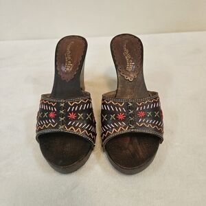 Skechers sandals, Leather with Floral embroidery, Brown Wooden Block Heels, “Somethin' Else” style Deadstock Vintage Y2K The chunky heels give these a 70s vibe, they are in very good condition!