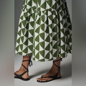 Stylish midi dress with geometric pattern. Features long sleeves and a flowing skirt. Perfect for any occasion.