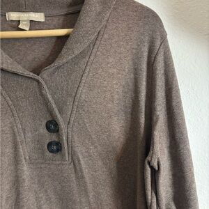 Elegant taupe sweater with a shawl collar. Features button accents. Ideal for layering.
