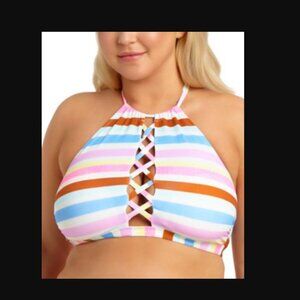 Show off your style stripes in this pretty plus size bikini top from California Waves, a sleek high neck design accented with colorful stripes and a chic strappy detail at the front.