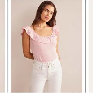 Boden Pink Red White Ruffled Off Shoulder Ribbed Top Blouse Seersucker Stripe 6
