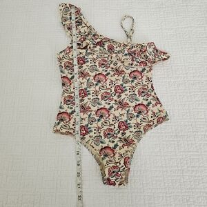 Charming floral one-shoulder swimsuit for kids. Features a delightful pink and blue pattern. Perfect for fun days at the pool or beach.