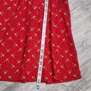 Color and Pattern: The dress is predominantly red with a recurring pattern and logo.