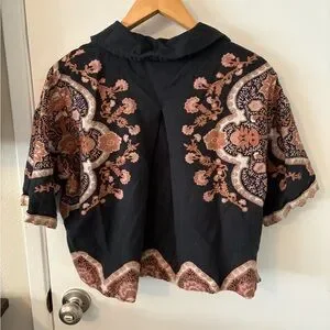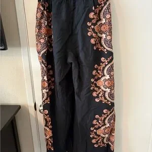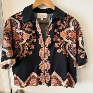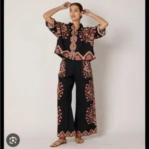 Experience the unique style of Cleobella with this casual button down shirt and pant set, showcasing a bold black and orange color scheme. The shirt's intricate design adds a touch of elegance, making it a perfect choice for any casual outing. Crafted with attention to detail, this piece effortlessly combines comfort and fashion.