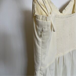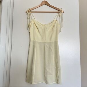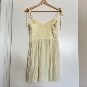 Elegant pastel butter yellow mini dress by Wilfred. Features delicate shoulder bow ties, cups, ruffled trim, smocked back, side zipper closure, lined.