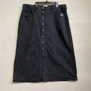 , Thread denim skirt size 16, High-rise cotton spandex skirt, Casual black midi denim skirt, A-line black skirt, Women’s plus size denim midi, Belted black high rise skirt, Midi skirt with fly button closure, Universal Thread skirt with stretch, Black A-line skirt for curvy women