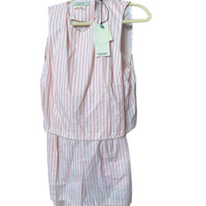 One piece shorts by Scotch & Soda. Top is open style back with zippered shorts. Pink and white pinstripe.