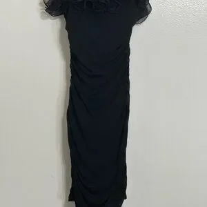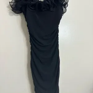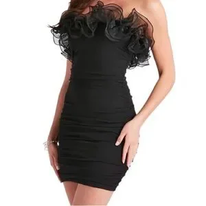 This elegant black strapless dress features a chic ruffled neckline, perfect for any special occasion. Its sleek design offers a flattering fit, making it a must-have addition to your wardrobe.