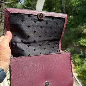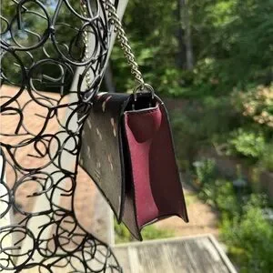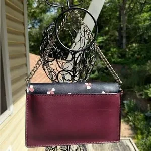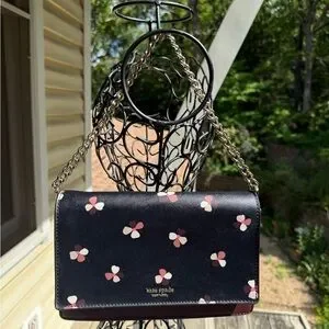 Kate Spade New York Cameron Convertible Crossbody in the "Dusk Buds Ditsy" floral print.Product DetailsMaterial: Saffiano leather or PVC.Colors: Features a black front with ivory, blush, and burgundy floral motifs, paired with a deep burgundy/plum back and bottom.Dimensions: Approximately 9.2" W x 5.8" H x 2.6" D.Features:Flap with a magnetic snap closure.Convertible design with a detachable gold chain strap for use as a crossbody, shoulder bag, or clutch.Interior features include a slide pocket and logo lining