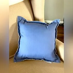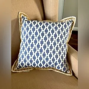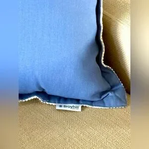 Add a touch of elegance to your home with this BROYHILL geometric blue and white throw pillow, solid on other side. Perfect for enhancing any living space. 18x18 Excellent condition