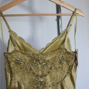 Chic gold dress with lace and floral embellishments. Features a stylish high-low hem.