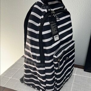 Chic backpack with bold stripes. Includes front zip pocket, spacious, zippered main compartment with dedicated laptop sleeve. Thick, padded, U-shaped shoulder straps for comfort and even weight distribution.