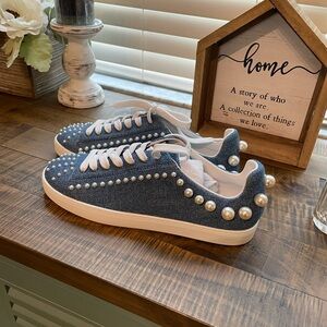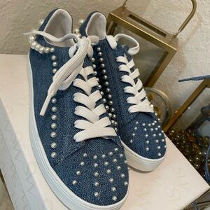 These Stuart Weitzman sneakers feature a denim blue fabric upper adorned with white decorative studs, creating a stylish contrast. The low-top design is complemented by white laces and a clean white rubber sole, offering a blend of classic sneaker elements with a fashionable twist.