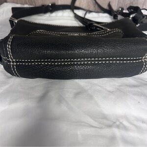 Sleek black leather crossbody. Front zip pocket. Adjustable strap. Perfect for everyday use.