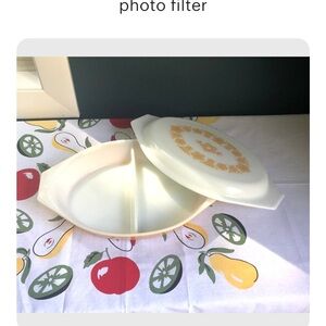 Vintage Pyrex Butterfly Gold Divided Casserole Baking Dish 1 Quart with Lid. Milk glass on inside/ gold on outside. Lid is milk glass with gold flowers. This is a beautiful vintage casserole dish.