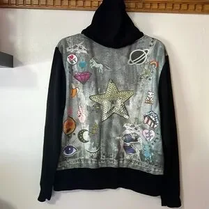 Terez Black Zip Up Hoodie Jacket with Graphic 80’s- 90’s Design. Size Medium
