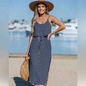 Embrace the resort vibe with this elegant sundress from Cupshe, featuring a sleeveless design and delicate spaghetti straps. The blue and white color scheme adds a refreshing touch, while the midi length ensures a breezy, casual style perfect for warm weather getaways.