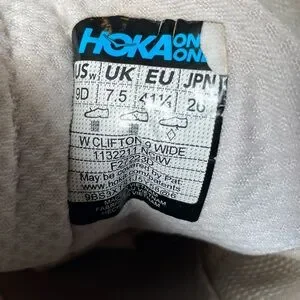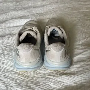 Step into comfort and style with Hoka's athletic shoes, featuring a sleek white and blue design. These shoes boast a cushioned sole for superior support, making them perfect for any active occasion. The minimalist aesthetic and versatile colorway ensure they complement any outfit effortlessly. Slight wear. Good, lived in condition.