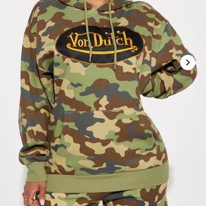 Eye-catching Von Dutch pullover with green camouflage design. Prominent logo on chest. Comfortable and stylish.