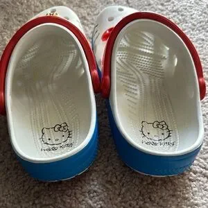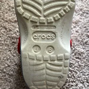 These stylish CROCS sandals showcase a vibrant red and white color scheme, highlighted by decorative bows on the top. The perforated design ensures breathability, while the slip-on style offers effortless comfort for everyday wear.