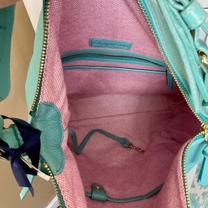 Aqua Pebbled Leather with white stitching & gold hardware.