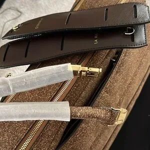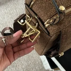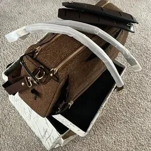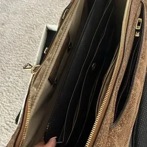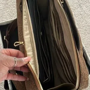 Stylish brown cork convertible bag. The bag can be work as a large briefcase, shoulder/crossbody, and backpack. Bag is expandable to increase capacity. Bag includes handles, shoulder/crossbody straps, shoulder pads, and an additional set of cork handles.