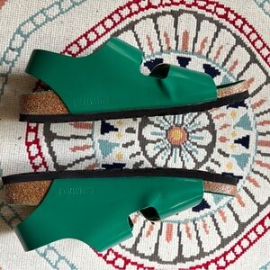 These Birkenstock sandals showcase a striking green and gold color combination, featuring a sleek design with multiple straps and a secure ankle buckle. The flat sole ensures comfort, making them ideal for both casual and dressy-casual occasions.