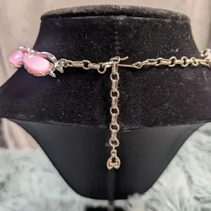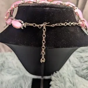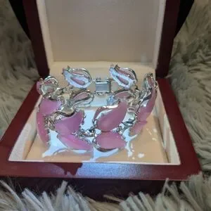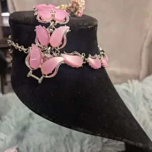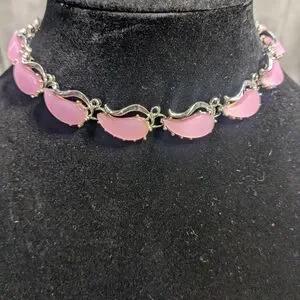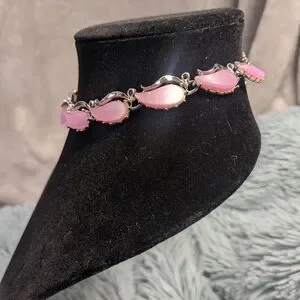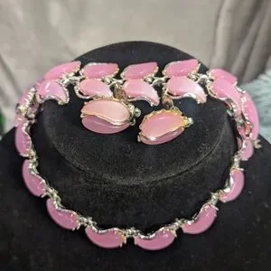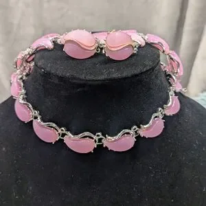 A rare vintage thermoset 3 piece set includes choker, bracelet and clip on earrings in a gorgeous Barbie pink hue. Wear this with a cute pink floral sundress and get instant attention and questions as to what you are wearing.